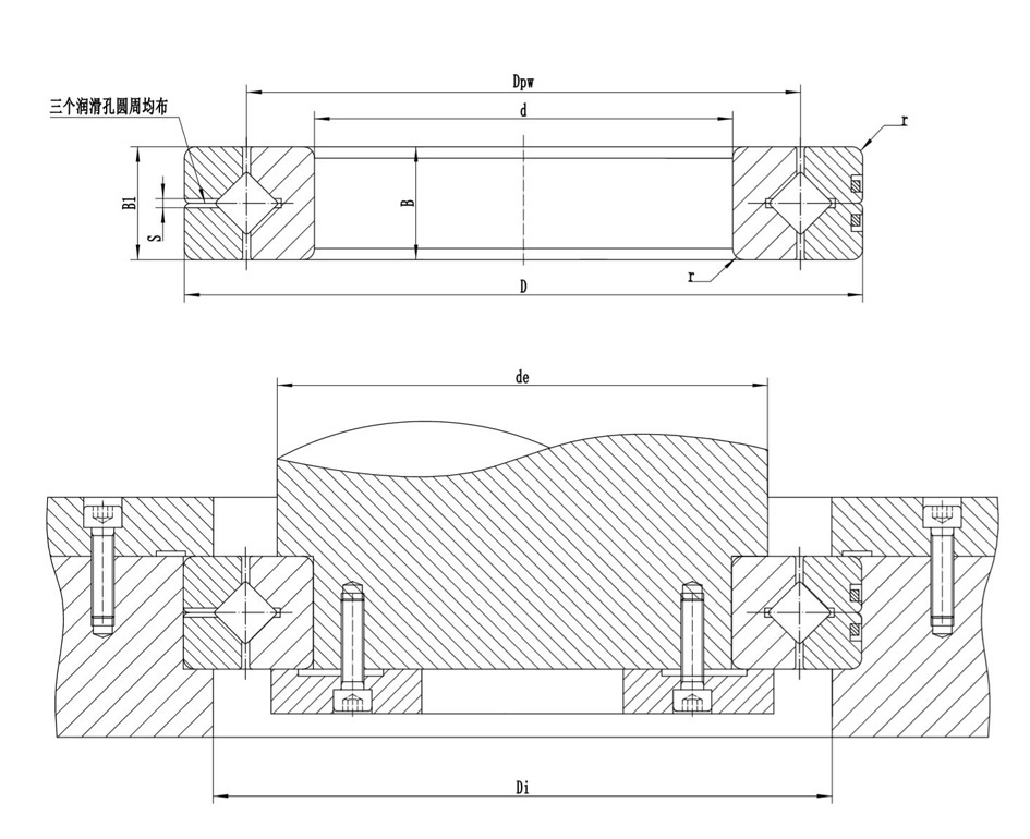SX 系列(外環(huán)分割型、內環(huán)旋轉用)其結構與RB系列類似,外環(huán)是兩分割的結構,通過三個固定環(huán)連接,內環(huán)一體設計,適合于要求內環(huán)旋轉精度高的部位。