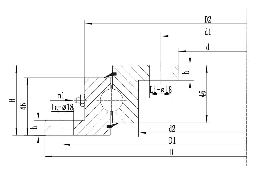 | INA No. | Rothe Erde No. | TG No. | Da | D | di | H | La | Li | n1 | n2 | φ1 | φ2 | D1 | d | b | h | B | C | Di | da | (KN) | (KG) |