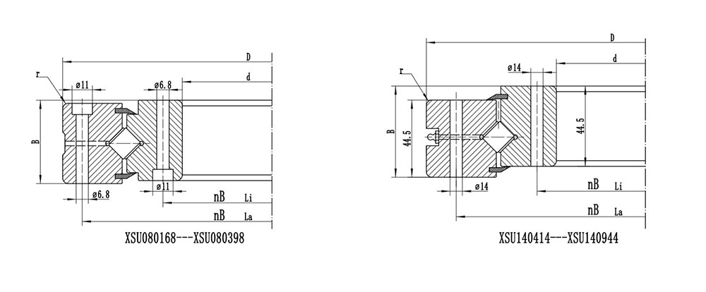 XSU 系列(內(nèi)外環(huán)一體型),帶安裝孔,無齒雙側(cè)密封型交叉圓柱滾子回轉(zhuǎn)支撐軸承,能用于外環(huán)和內(nèi)環(huán)旋轉(zhuǎn)。